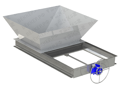 Особенностью конструкции является то, что щит перемещается по опорным роликам для снижения трения подвижных элементов. Крепление затвора к бункеру осуществляется с помощью фланца квадратного сечения, с обратной стороны затвора возможно предусмотреть переход на квадратный или круглый фланец.