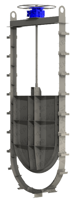 Данный тип затвора предназначен для перекрытия потока жидкости в открытом крупном канале. Особенностью данной конструкции является мощный силовой набор и применение опорных колес для снижения трения подвижных элементов затвора.